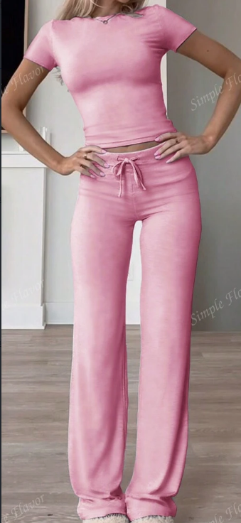 2pcsSet Casual Solid Color Short Sleeve T-Shirt And Pants, Spring And Summer
