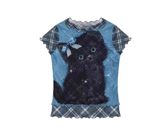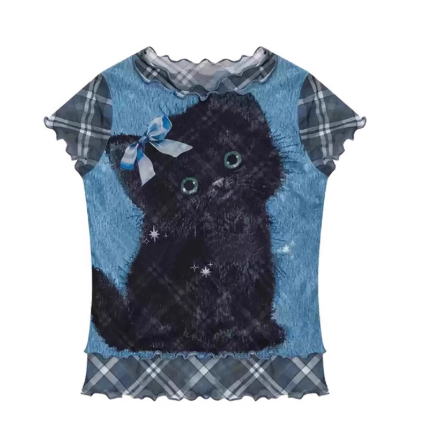 Slimming Plaid Faux Two-piece Top With Cat Print