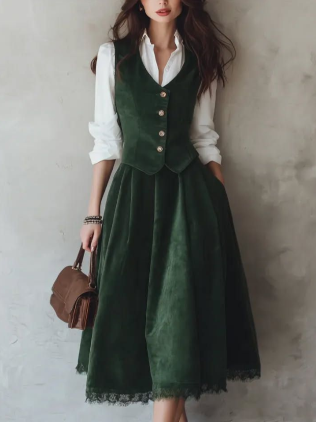 Velvet Button-down V-neck Casual Vest Dress Set