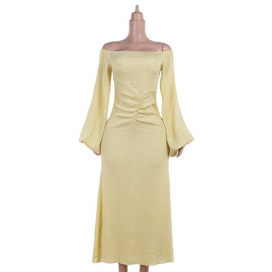 WQ24055 Off-shoulder Waist Pleated Puff Sleeve Dress